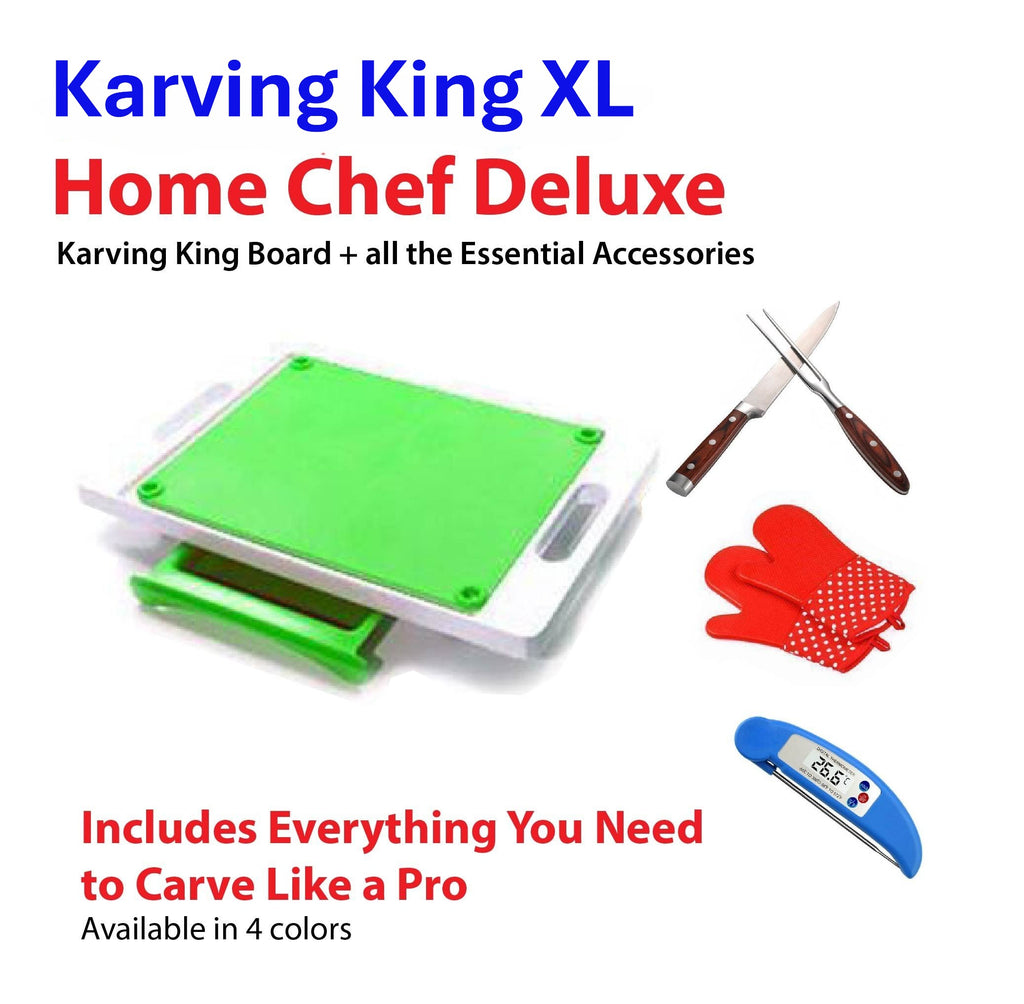 This special offer includes our best selling Karving King accessories: digital meat thermometer, set of silicone oven mitts and a professional carving set. With the Home Chef Deluxe you have everything you need to prepare your meals like a pro.