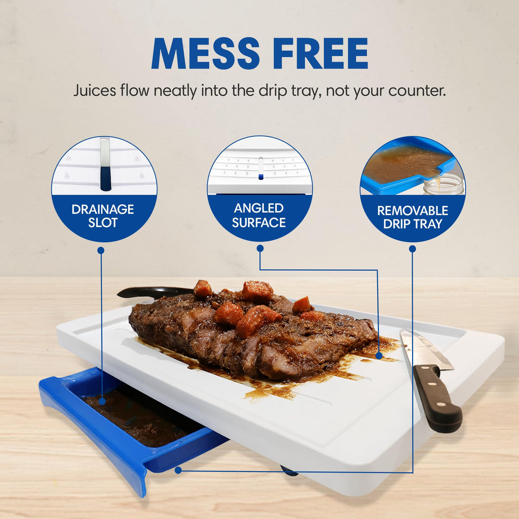 - Angled surface and drainage slots allow you to collect delicious juices in the removable drip tray