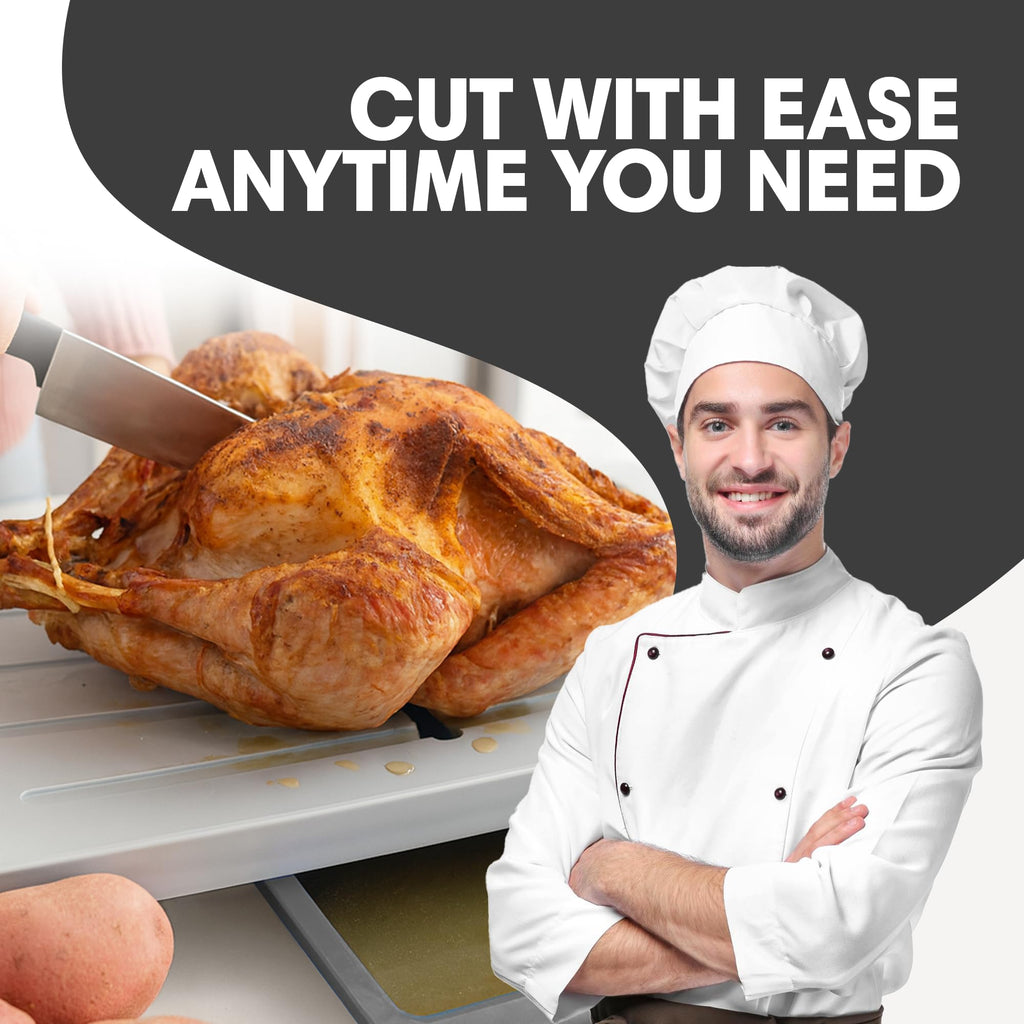 Your Karving King Plus Meal Prep system also includes a removable full-sized supplemental cutting board which enables you use it while in the main board or use it directly on the countertop – perfect for cutting fruits and veggies.