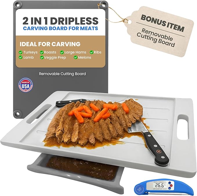 - The extra large cutting surface is perfect for year-round use when carving large meats, such as ribs, turkey, roasts and more